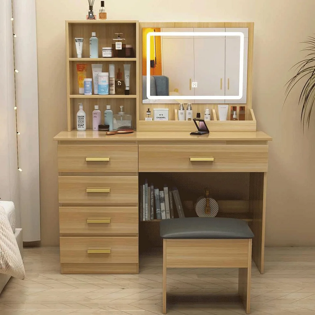 Tocador,Tocador de Maquillaje con Luces de Espejo, Vanity Tocador con 5 Cajones,Estantes de Almacenamiento,Taburete Acolchado, Tocador con 3 Estantes, Mesa de Maquillaje para Dormitorio Blanco