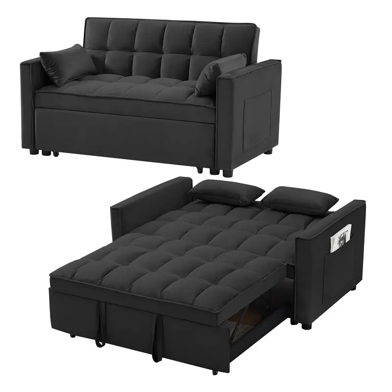 Sofá convertible de terciopelo 3 en 1, mejora de la versión anterior, con colchón plegable, respaldo inclinable, cojines y bolsillos para dormir, ideal para dormitorio, sala de estar y apartamento, cubierta de sofá en negro y gris