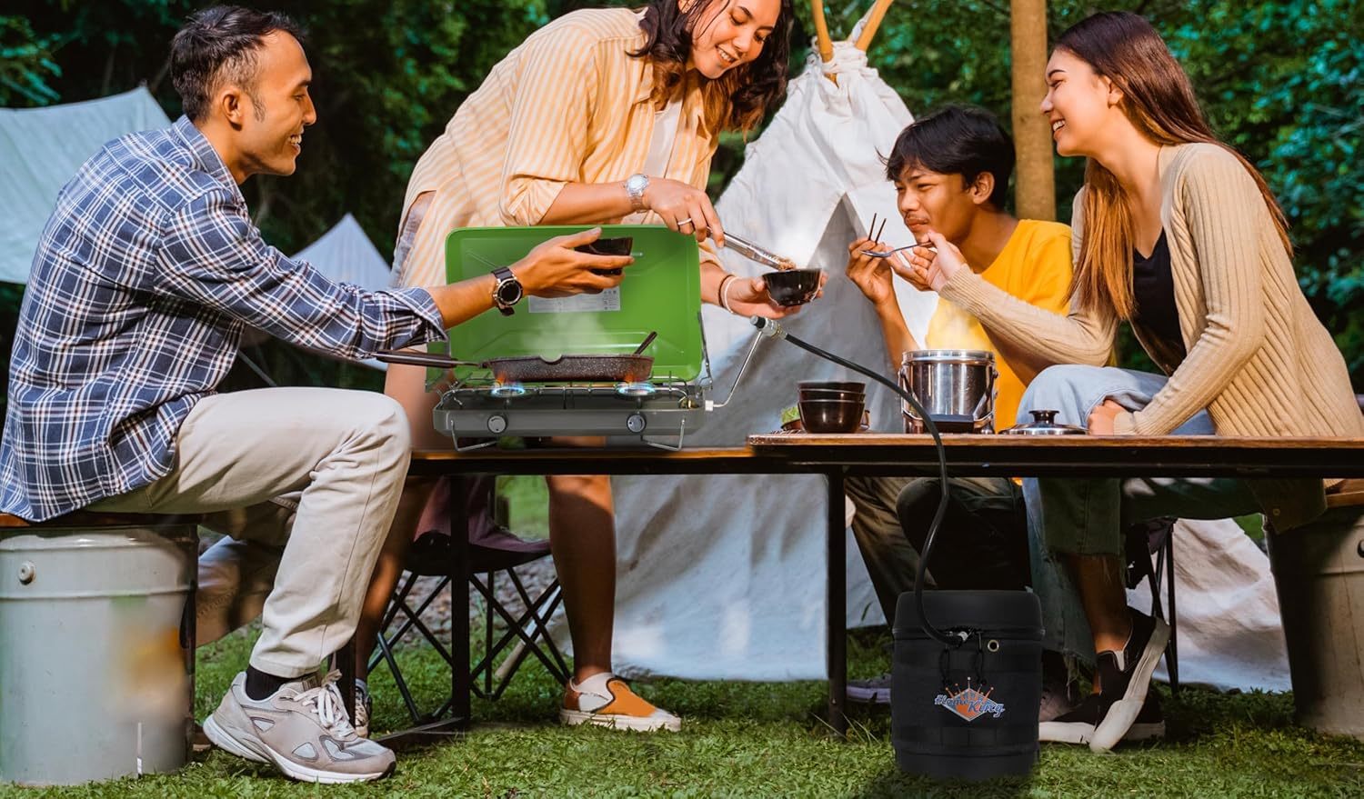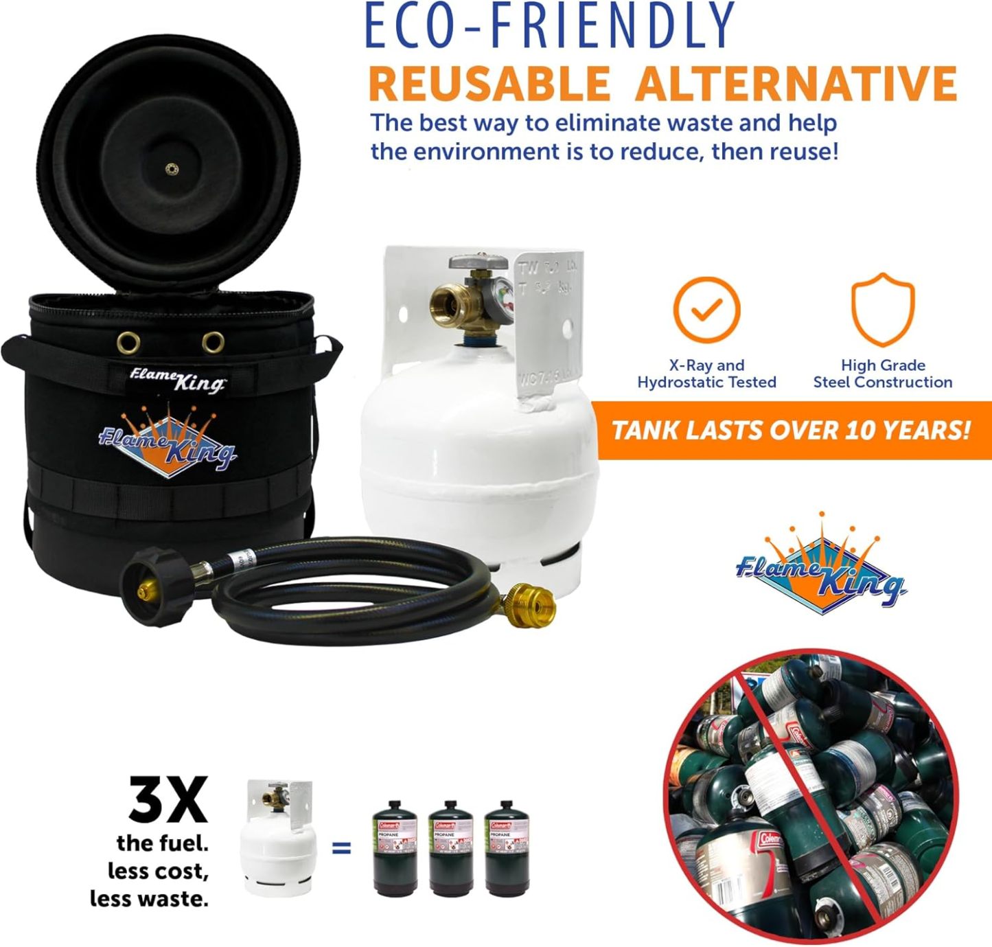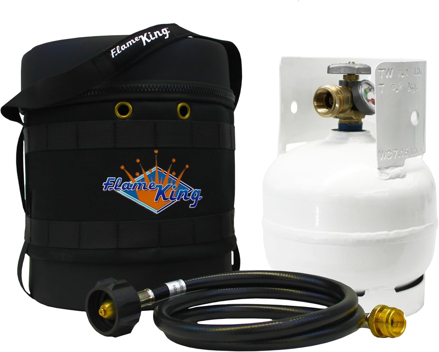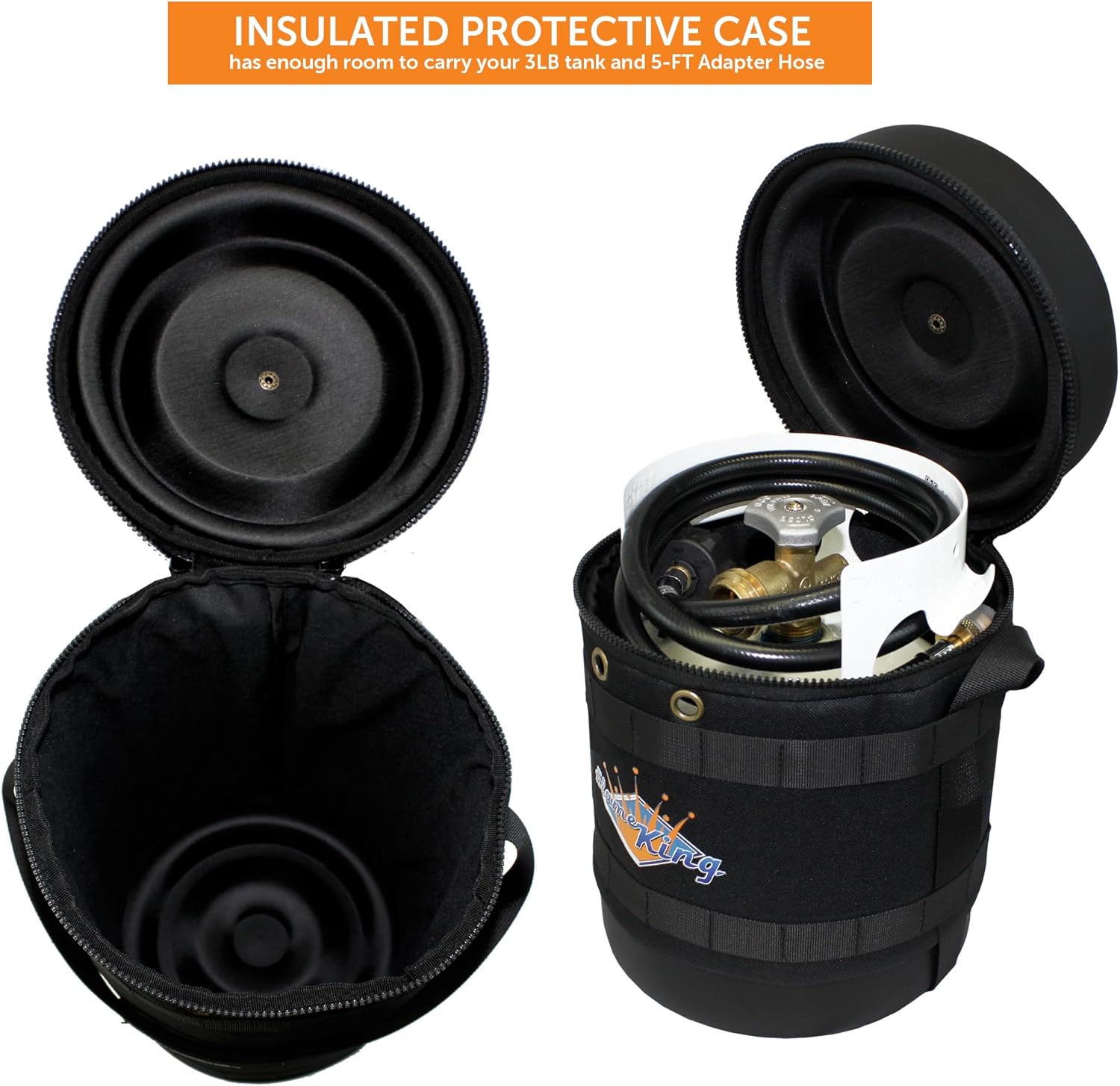 Flame King - Kit de transportador de gas - Funda protectora aislada, tanque de propano de 3 libras y manguera adaptadora para camping y aventuras al aire última intervensión, negro/blanco