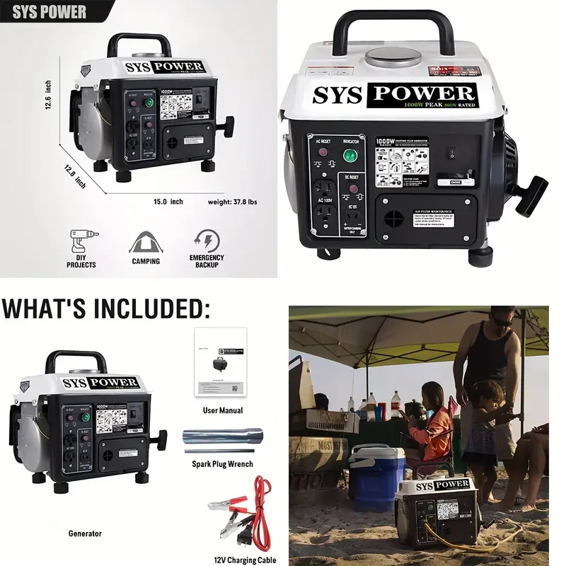 Peso ligero de 38.5 libras, diseñado con asas para proporcionar versatilidad adicional a los usuarios para un fácil transporte Potente motor de gasolina de 2 tiempos de 71 cc, gran confiabilidad, con un tanque de combustible lleno de 1.1 galones Funciona suave y silenciosamente hasta por 5 horas de operación continua segura con una carga de combustible del 50% La protección de circuito de reinicio remoto incorporada evita el sobrecalentamiento y los daños en el circuito Uso ideal para electrodomésticos, herramientas eléctricas, perfecto para acampar, hacer chupar rueda o en cualquier otro lugar donde necesite energía portátil