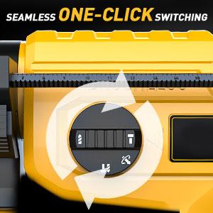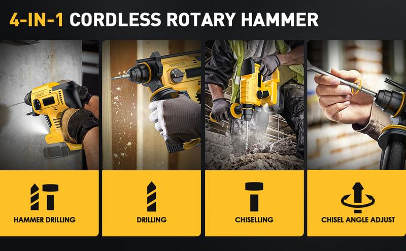 【Fácil de usar】—Con un peso de tan solo 2,7 kg, es perfecta para perforar en techos o hacia abajo. Permite cambiar rápidamente entre 4 modos: "Perforación con percusión", "Perforación", "Cincelado" y "Ajuste del ángulo del cincel", adaptándose a diversas tareas. Optimización en su máxima expresión.