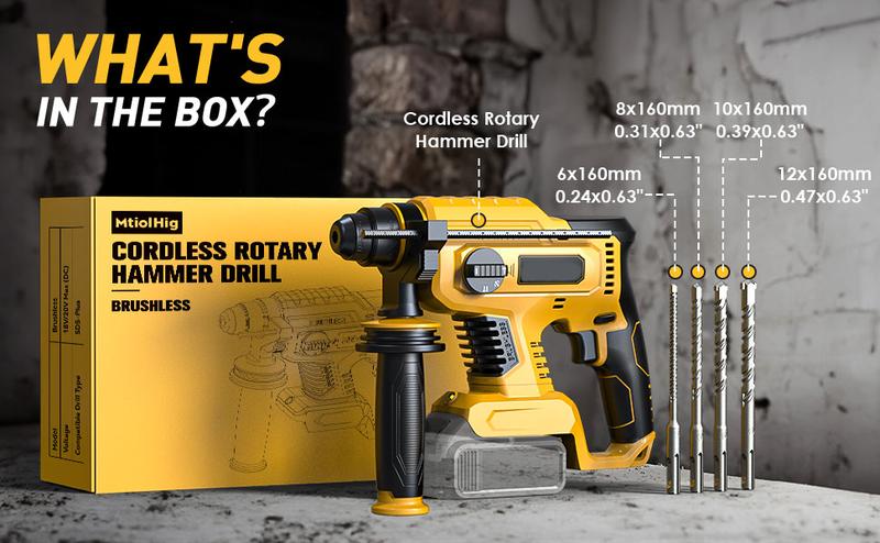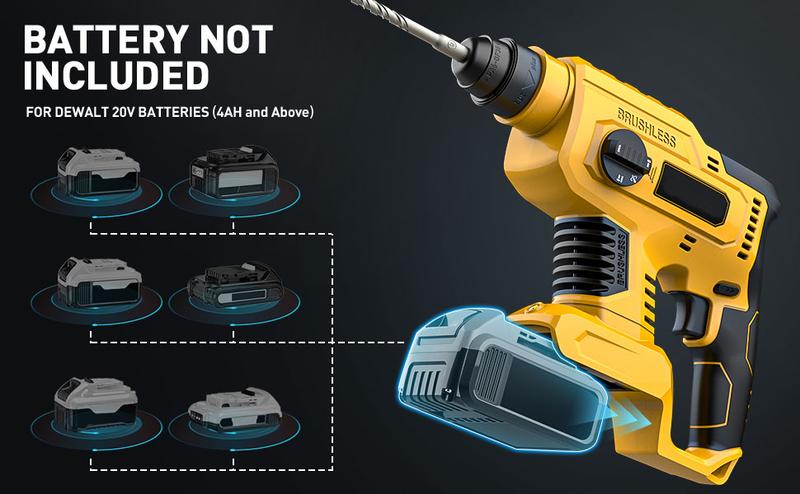 【Práctica y eficiente】: Con un diámetro máximo de perforación de 7/8 de pulgada en hormigón y 1,1 pulgadas en madera, nuestro taladro es adecuado para una amplia gama de proyectos de construcción y renovación. Se recomienda utilizar una batería de alta capacidad (4 Ah o superior) para un rendimiento óptimo.