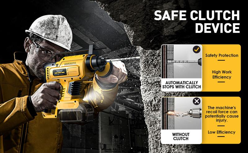【Control de seguridad】: El taladro percutor cuenta con un embrague de seguridad integrado contra sobrecargas y una función de apagado automático por sobrecalentamiento. Cuando la broca se atasca, el sistema de protección del embrague contra sobrecargas protege su muñeca y prolonga la vida útil del motor.