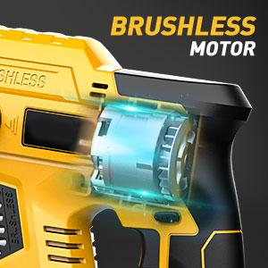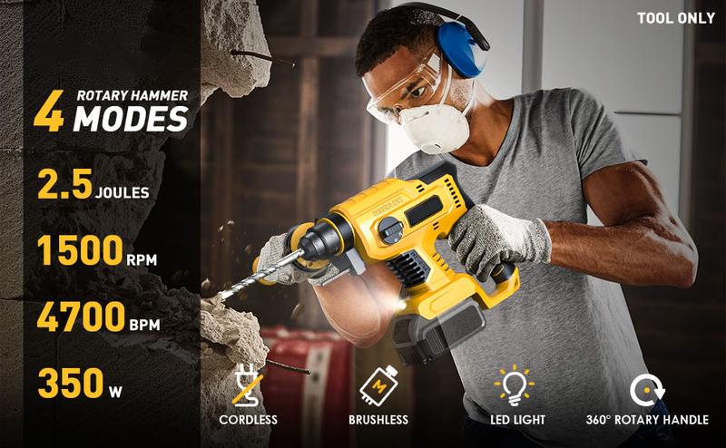 【Martillos perforadores potentes】: Este taladro percutor inalámbrico cuenta con 2,5 julios de energía de impacto, un motor sin escobillas y cuatro modos de trabajo ajustables, alcanzando hasta 1500 RPM y 4700 BPM. Esto proporciona la potencia necesaria para perforar rápidamente en hormigón, ladrillo, madera, metal, mampostería y mucho más.