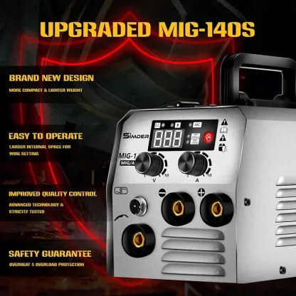 La máquina de soldadura S SIMDER es capaz de realizar tanto soldadura MIG como soldadura por arco. Proporciona una salida máxima de CC de 145 amperios. Este soldador MIG es ideal para principiantes que buscan un dispositivo de soldadura fácil de usar. Su modo sinérgico ajusta automáticamente el voltaje controlando la corriente, simplificando la operación y el arranque. Además, su tecnología avanzada de IGBT e inversor garantiza una soldadura efectiva y portátil, lo que le permite soldar donde sea necesario.