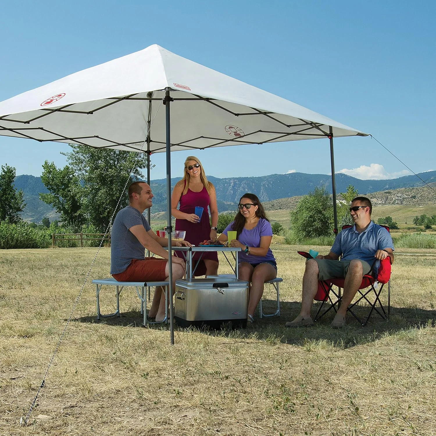 Lleva un poco de sombra fresca que es ligera y cabe en un espacio más pequeño con una luz Coleman y un refugio solar instantáneo rápido de 10 x 10. Un diseño minimalista de marco hace que este refugio de 10 libras. Más ligero que un refugio solar instantáneo Coleman comparable. Pero solo tarda unos tres minutos y tres pasos en configurar 100 sq. Pies de sombra, incluyendo los aleros anchos que se extienden más allá de la huella más pequeña del refugio. Los postes telescópicos son xfáciles de extender en su lugar gracias a la tecnología Lite de agarre cómodo sin pellizcos y pies grandes que son lo suficientemente grandes como para pararse mientras montas el refugio. Una vez que está arriba, el material uvguard ofrece protección UPF 50+ contra los peligrosos rayos del sol. Cuando la diversión termina, el marco se pliega para un almacenamiento compacto.