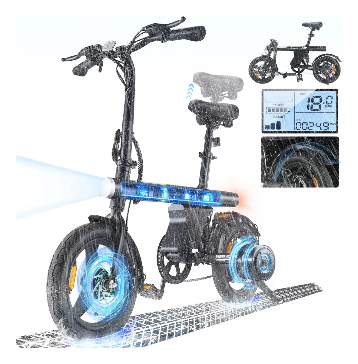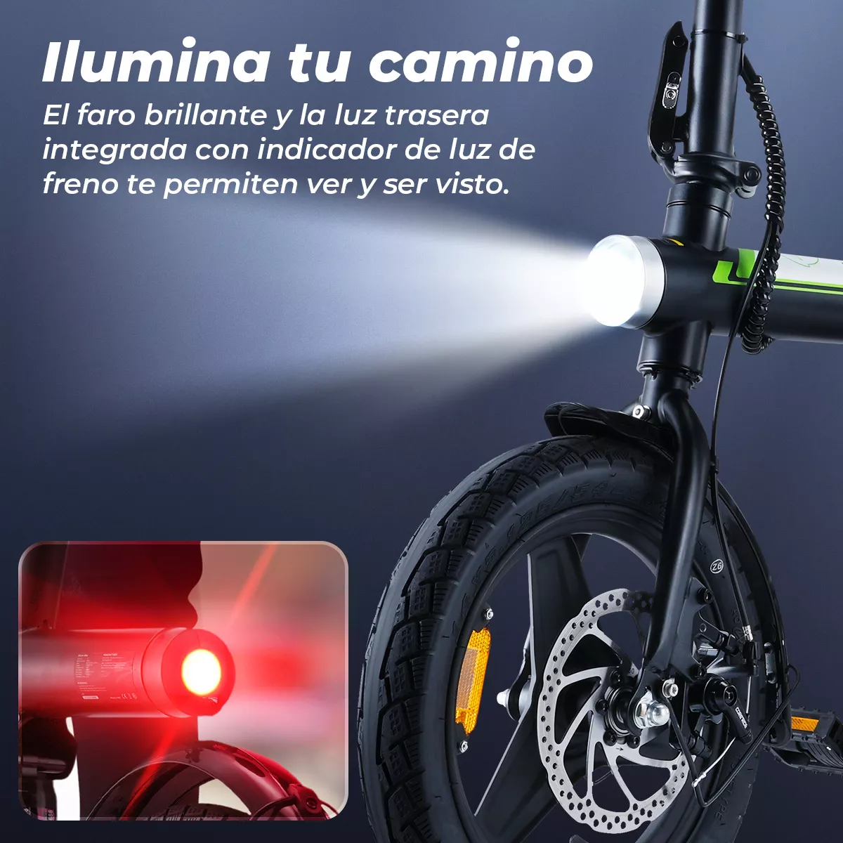 Los frenos de disco dobles proporcionan una potencia de frenado fiable, lo que garantiza que puedas detenerte de forma rápida y segura. El faro brillante y la luz trasera integrada con indicador de luz de freno te mantienen visible para todos.
