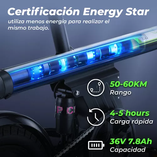 La batería reemplazable de 36 V 7,8 Ah está completamente oculta dentro del cuadro de la bicicleta eléctrica para su protección. Carga rápida 2X en 3-4 horas para impulsar tu viaje hasta 60 KM (modo de asistencia de pedaleo).