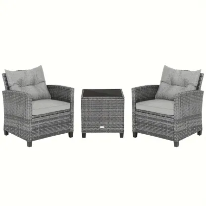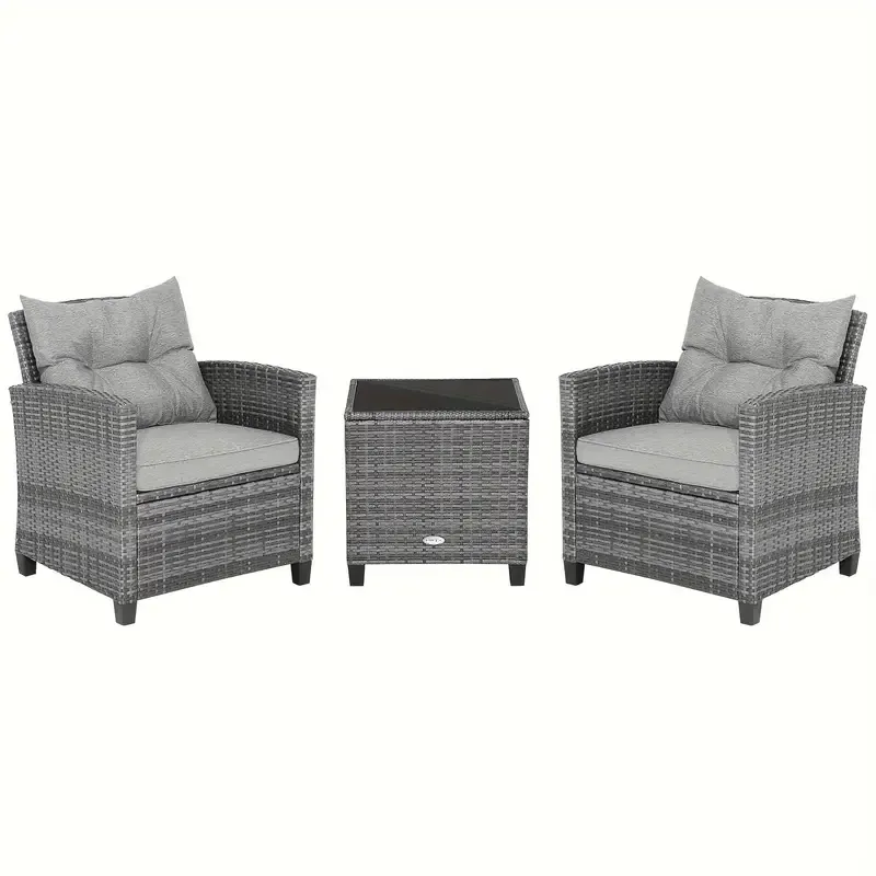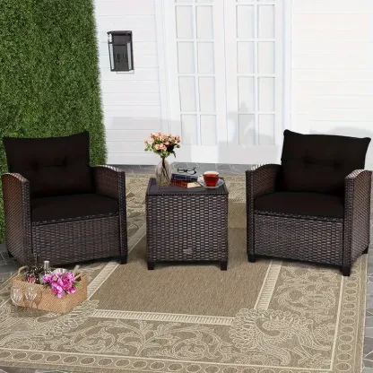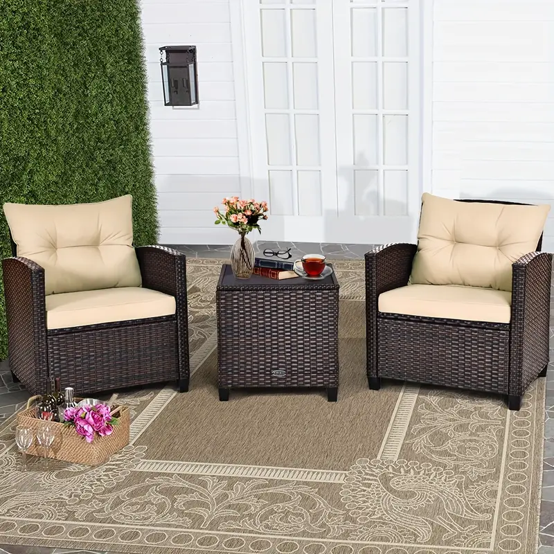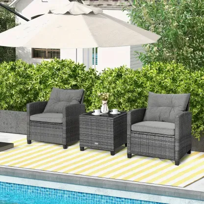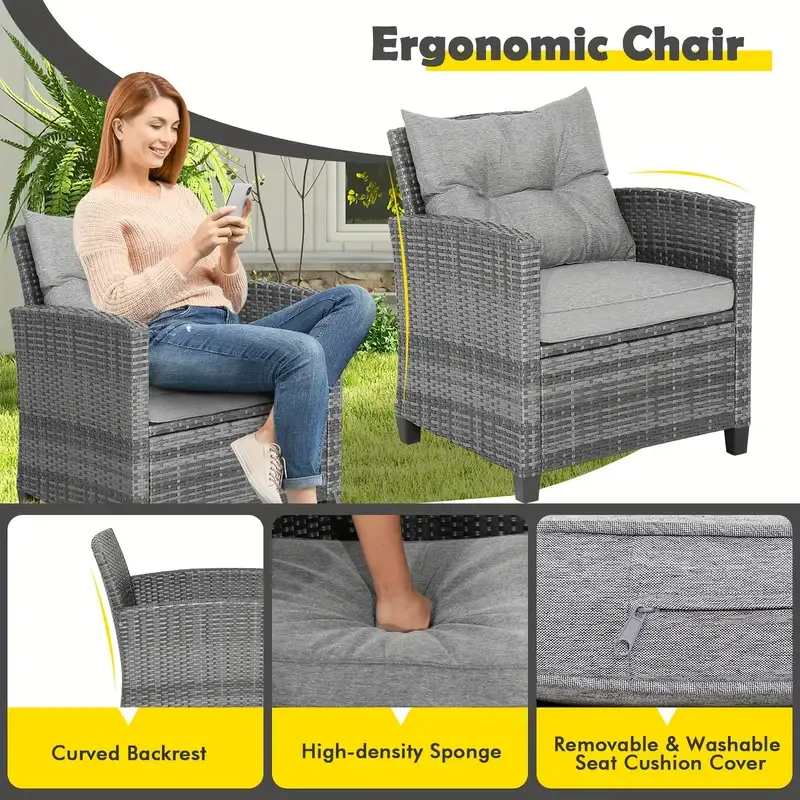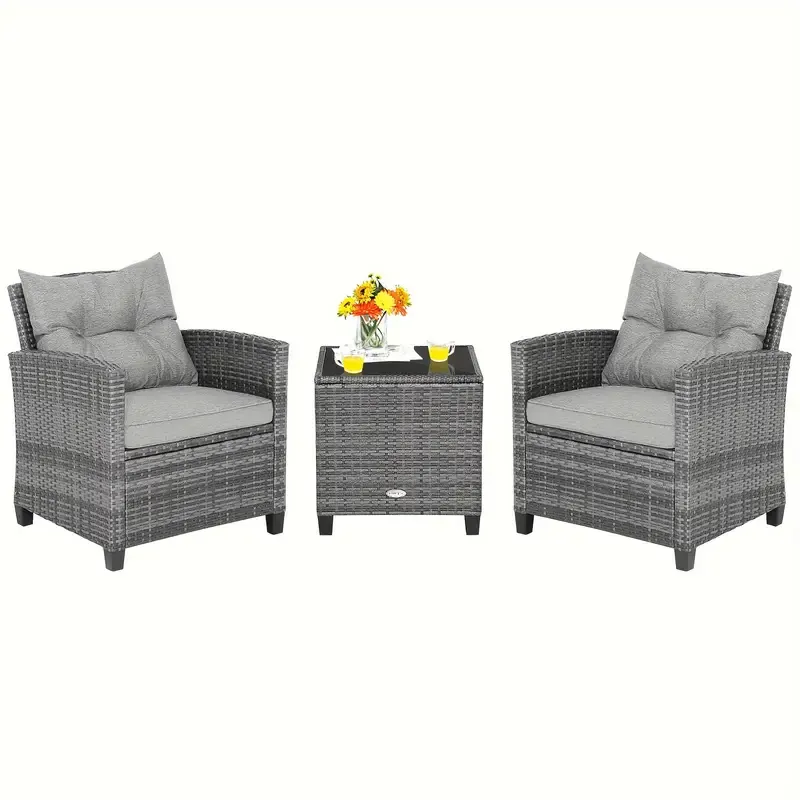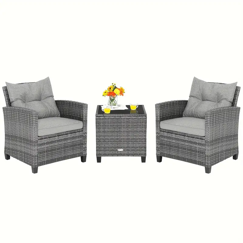 Juego de sofá de ratán para patio Costway de 3 piezas con 2 sillones tapizados, tapa de vidrio macizo y marco de ratán resistente a la intemperie: perfecto para relajarse en su patio, porche, balcón o junto a la piscina al aire libre