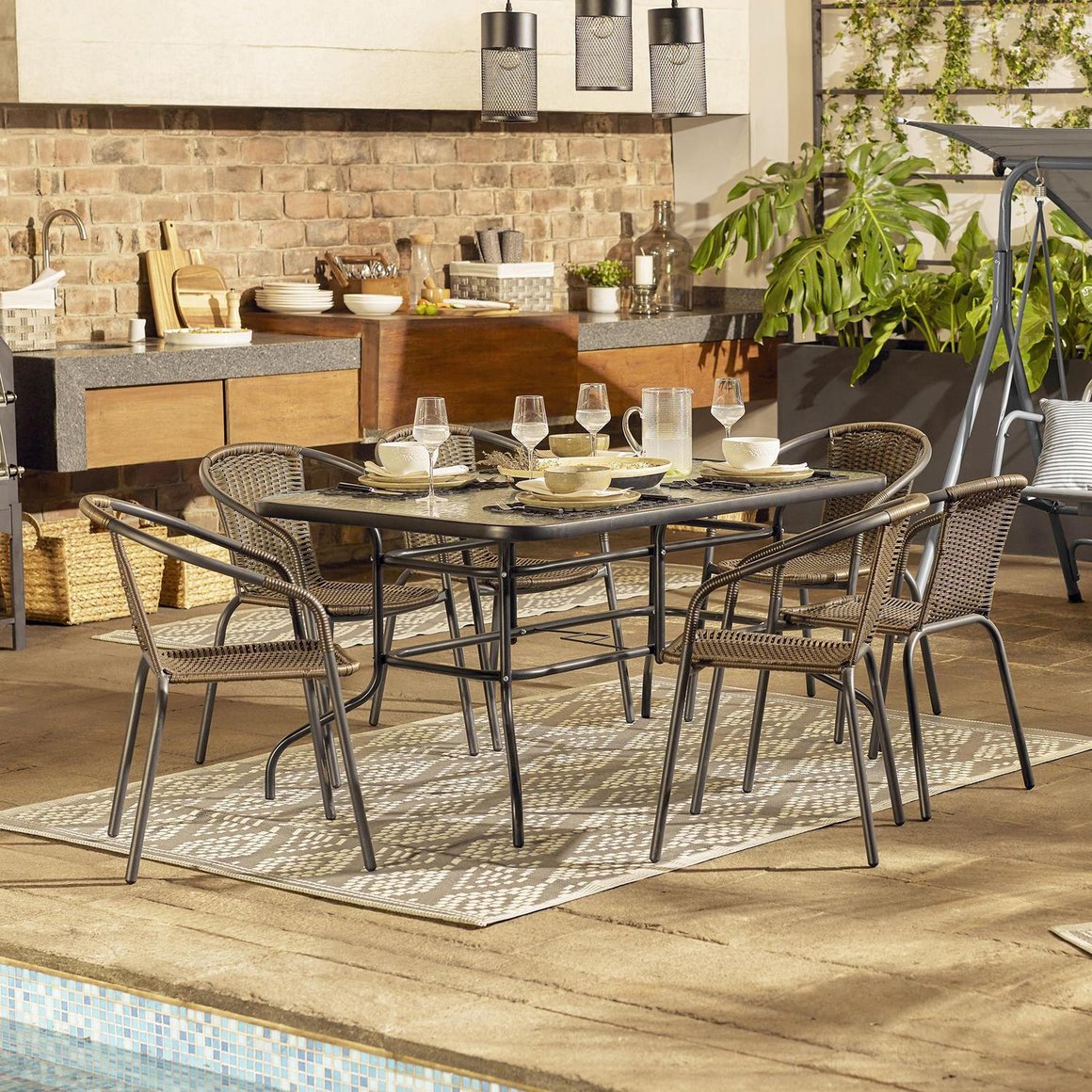 La mesa rectangular de terraza con vidrio templado de 140x90 cm en color negro de la marca Just Home Collection es una adición elegante y práctica para cualquier espacio al aire libre.