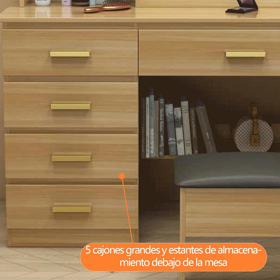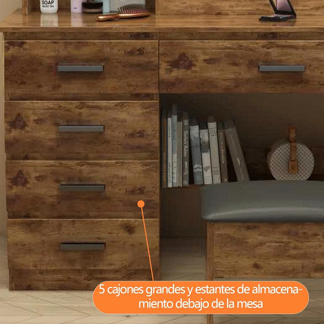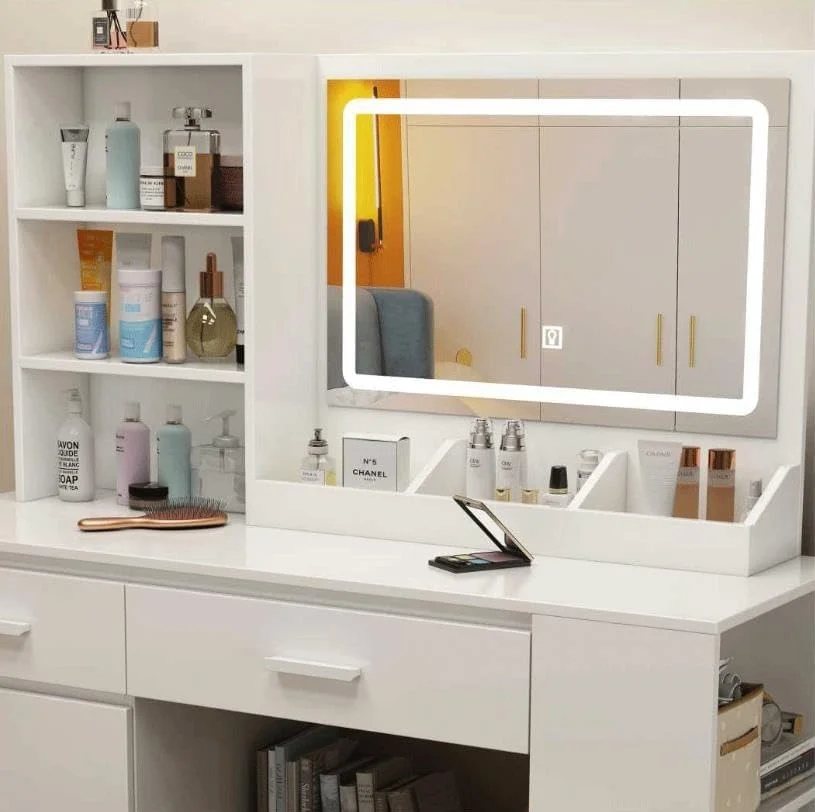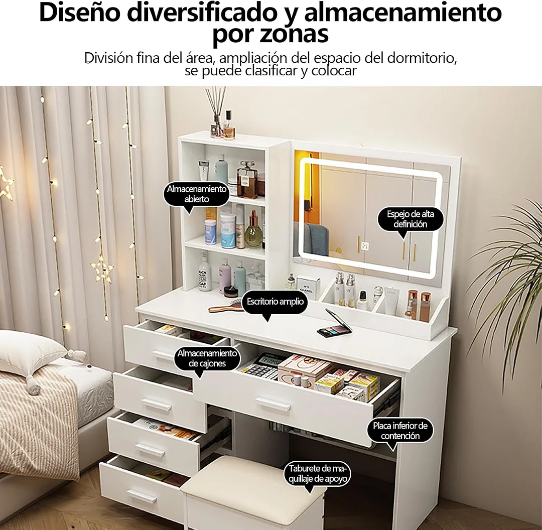 Tocador,Tocador de Maquillaje con Luces de Espejo, Vanity Tocador con 5 Cajones,Estantes de Almacenamiento,Taburete Acolchado, Tocador con 3 Estantes, Mesa de Maquillaje para Dormitorio Blanco