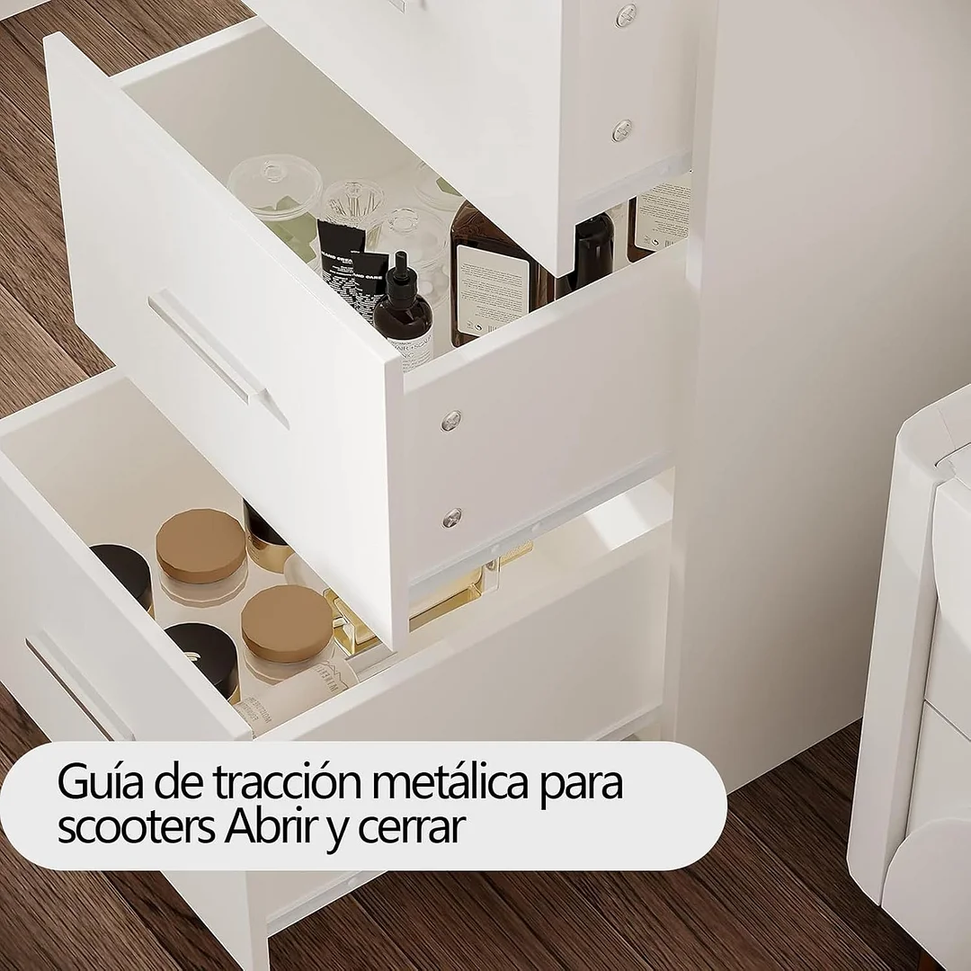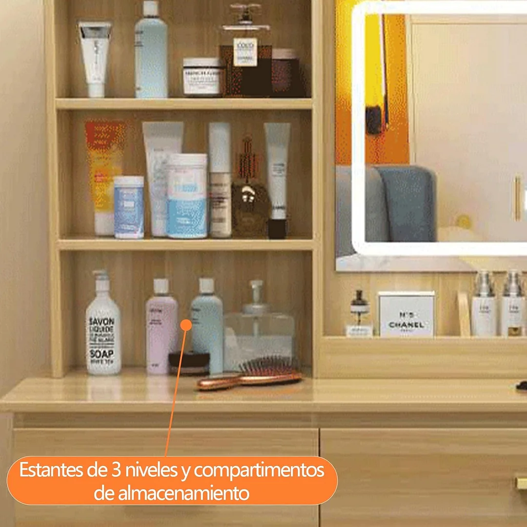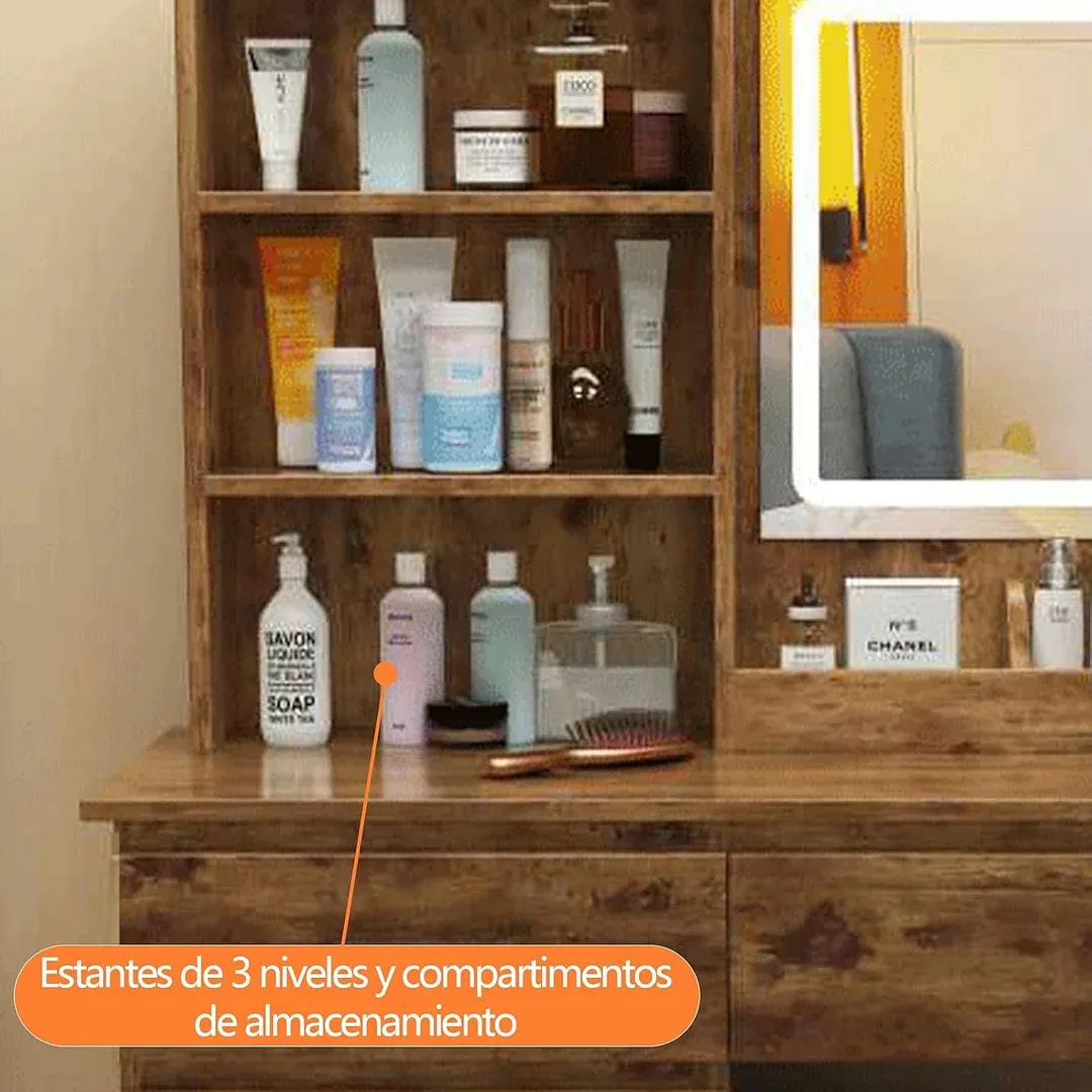 Tocador,Tocador de Maquillaje con Luces de Espejo, Vanity Tocador con 5 Cajones,Estantes de Almacenamiento,Taburete Acolchado, Tocador con 3 Estantes, Mesa de Maquillaje para Dormitorio Blanco